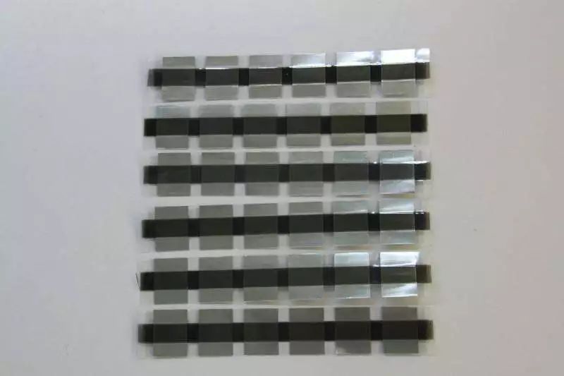⑵板式極耳(金屬帶加上膠片后裁切成單個(gè)的,然后成排擺放用兩片薄透明塑料片夾在中間),用于普通生產(chǎn)產(chǎn)線。