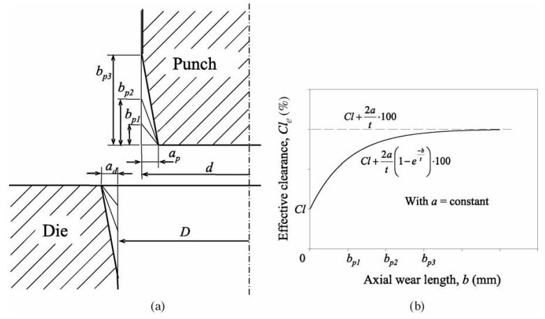 (a)模具磨損示意圖,(b)有限沖切間隙隨著磨損量增加曲線關(guān)系
