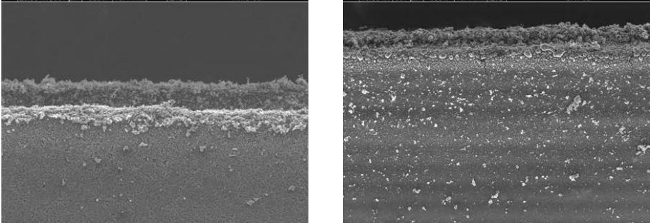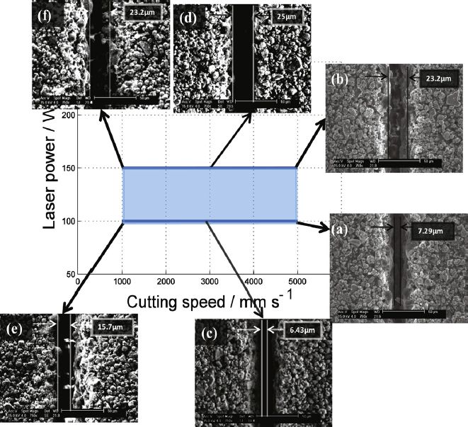 其中,激光能量和切割移動(dòng)速度是兩個(gè)主要的工藝參數(shù),對切割質(zhì)量影響巨大。圖5是不同的激光切割工藝條件下單面涂層負(fù)極極片的切邊形貌,圖6是不同的激光切割工藝條件下單面涂層正極極片的切邊形貌。當(dāng)激光功率太低或者移動(dòng)速度太快時(shí),極片不能完全切開,而當(dāng)功率太高或移動(dòng)速度太低時(shí),激光對材料作用區(qū)域變大,切縫尺寸更大。