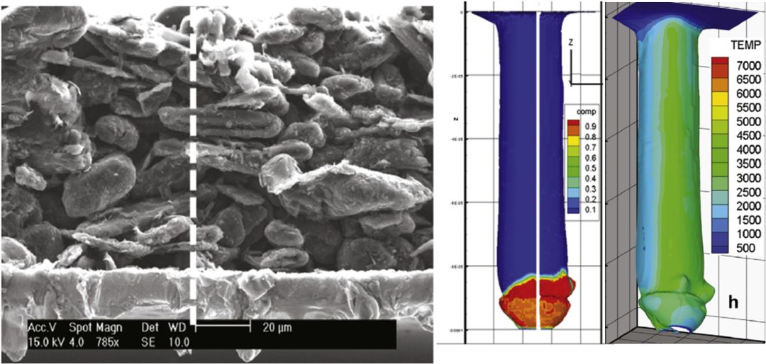由于鋰離子電池極片是雙面涂層+中間集流體金屬層的結(jié)構(gòu),而且涂層與金屬箔材之間性質(zhì)差異大,對激光作用的響應(yīng)也不相同。激光作用在負(fù)極石墨層或正極活物質(zhì)層時(shí),由于它們具有很高的激光吸收率,導(dǎo)熱系數(shù)也很低,因此,涂層需要相對較低的熔化和汽化激光能量,而金屬集流體對激光具有反射作用,并且熱傳導(dǎo)快,因此金屬層的熔化和汽化激光能量升高。圖7是單面涂層的負(fù)極在激光作用下極片厚度方向的銅成分和溫度分布,當(dāng)激光作用在石墨層時(shí),由于材料的特性,石墨主要發(fā)生汽化,當(dāng)激光侵入到金屬銅箔時(shí),銅箔開始發(fā)生熔化,形成熔池。工藝參數(shù)不合適時(shí),可能出現(xiàn)問題:(1)切邊涂層脫落,露出金屬箔材,如圖8左圖所示;(2)切邊周圍出現(xiàn)大量切屑異物。這些都會(huì)導(dǎo)致電池出現(xiàn)性能下降、安全性品質(zhì)問題,如圖8右圖所示。因此,當(dāng)采用激光切割時(shí),需要根據(jù)活物質(zhì)材料和金屬箔材的特性,優(yōu)化合適的工藝參數(shù),才能既完全切割極片,又形成良好的切邊質(zhì)量,不產(chǎn)生金屬切屑雜質(zhì)殘留。